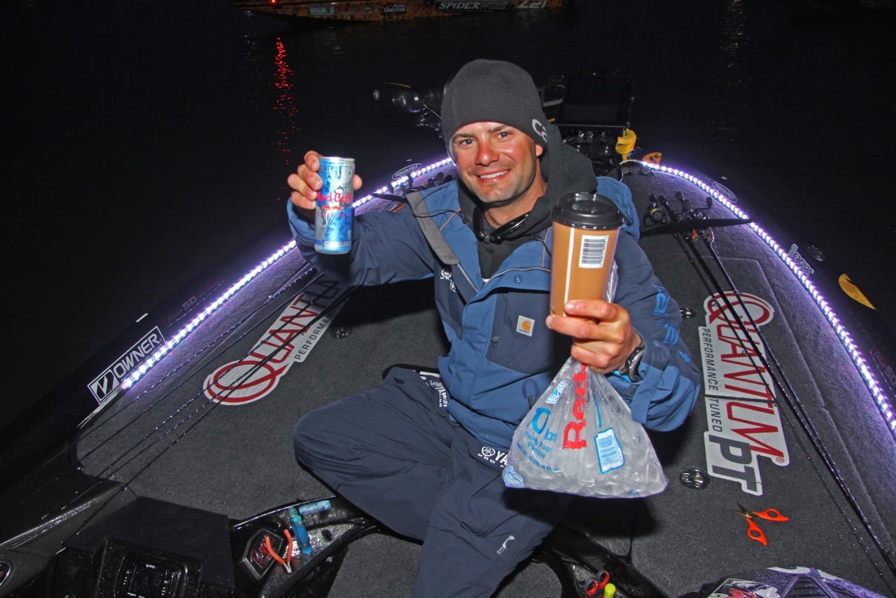 Carhartt angler Matt Lee began the first day of the Bassmaster Elite at Grand Lake with scrambled eggs, low carb wheat toast, and black coffee in his 5thwheel RV, but soon realized on the dark drive to the Wolf Creek launch that he had misplaced his wallet, and had no way to stop at a convenient store for a bag of ice and the day’s supply of caffeine drinks.