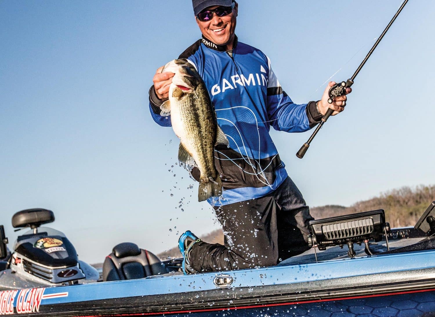 When asked to choose just two favorite colors of the new jig, he chose Peanut butter and jelly, and plain ‘ol brown. He ties the jig to 15-pound fluorocarbon, and fishes it on a 7.3:1 Quantum Tour S3 for plenty of speedy line pickup when a bass bites in deep water.