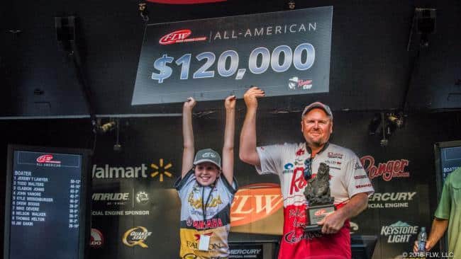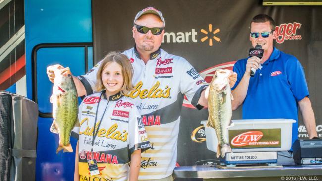 Day two brought sunny skies and higher temperatures. Because the lake is so shallow, slight changes in weather have a dramatic effect on the water temperatures and on the fish. Mayo was able to follow the fish and bring a limit to the scales again on day two. “At 2:30pm, I only had three in the live-well. I made a run back toward the ramp and hit a point that I found a concentration of fish on in practice. I put my last two in the live-well with ten minutes to go. As it turns out, I needed every ounce I had in my bag. After talking with Pam, I knew it was going to be close but to end up just .22 lbs ahead – unbelievable!”