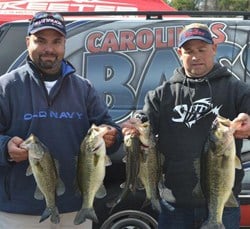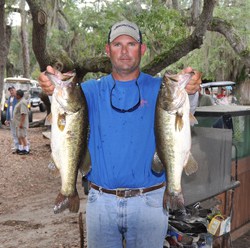 Chad Pipkens of Holt, Mich., leads the Co-angler Division with five bass weighing 10-12 followed by Rich Dalbey of Greenville, Texas, in second place with five bass weighing 10-11.