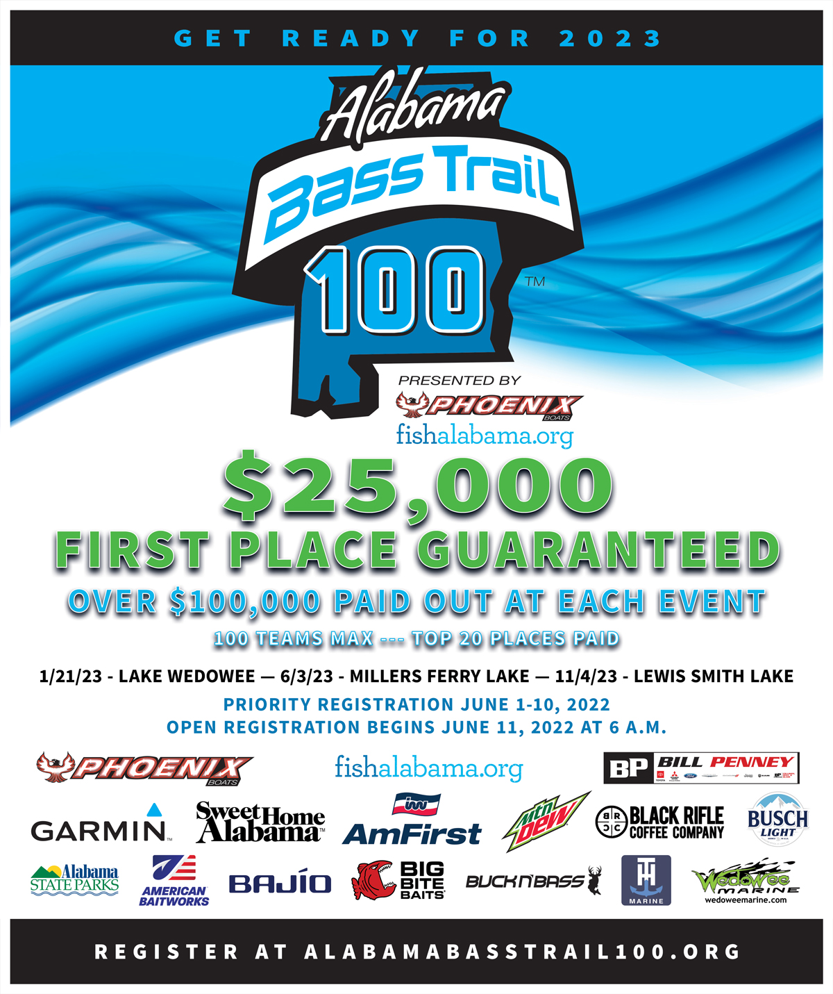 Proud sponsors of the 2022 MLF Bass Pro Tour include: 13 Fishing, Abu Garcia, A.R.E. Truck Caps, B&W Trailer Hitches, BallyBet, Bass Cat, Bass Pro Shops, Berkley, Covercraft, Favorite Fishing, Garmin, General Tire, Googan Baits, Grundéns, Guaranteed Rate, Humminbird, Lowrance, Luminox, Mercury, Minn Kota, Mossy Oak, Nitro Performance Boats, Onyx, Plano, Power-Pole, Power Stop, Rapala, Starbrite, Toro, Toyota, Wrangler, Yellowstone Bourbon and Zoom.