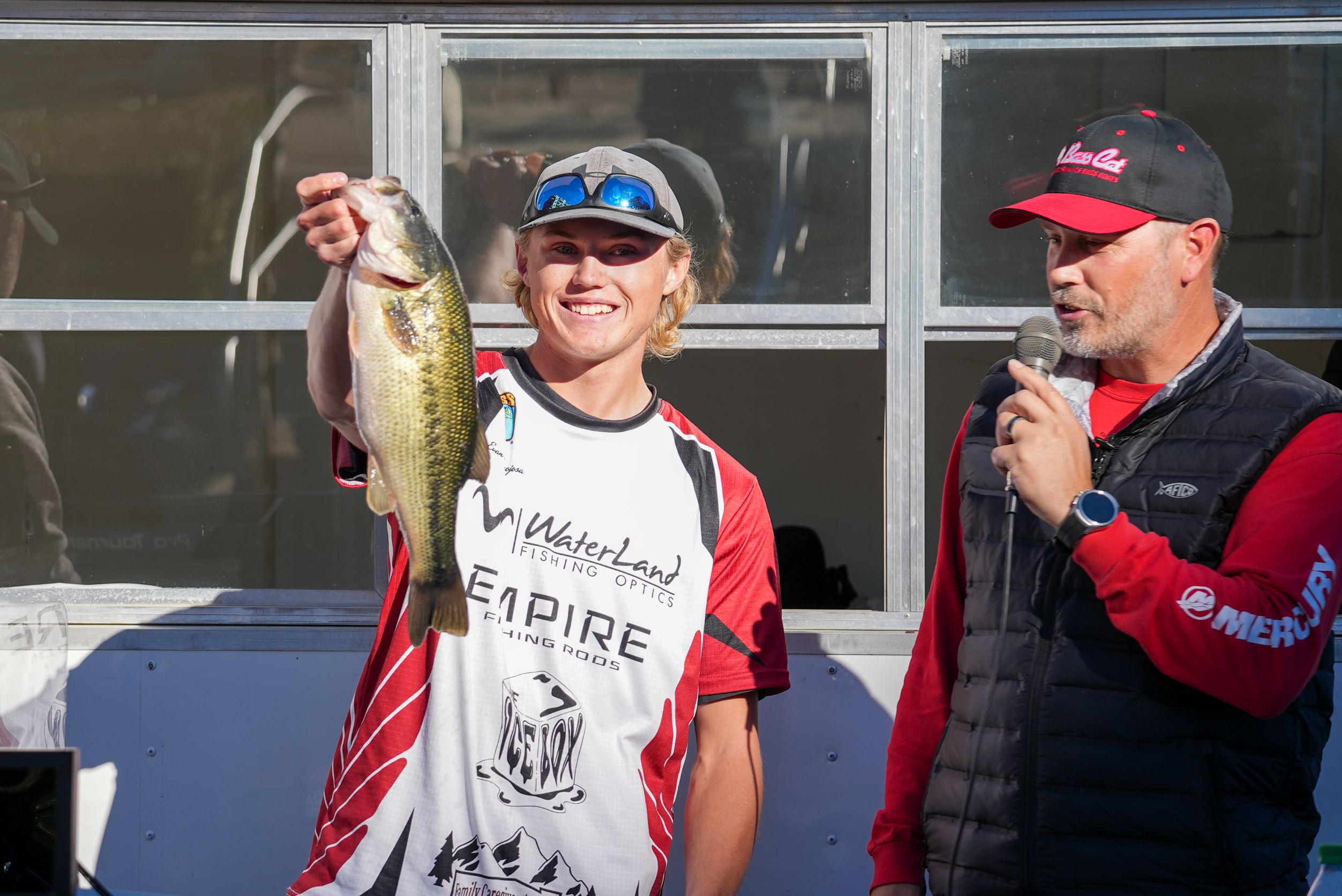 After confirming scores from all teams, Roy interviewed winners Jordan Hampton and Hunter Shelton. Roy asked Hampton if he thought they would be able to pull it off; he responded by saying, “Honestly, not with three fish. We didn’t think we would. But when we caught our first ones with a jig and then a Carolina rig, that’s what we’re used to back home, and we were going to fish it.” He went on to say that they planned to fish their strengths win or lose, Shelton agreed.
