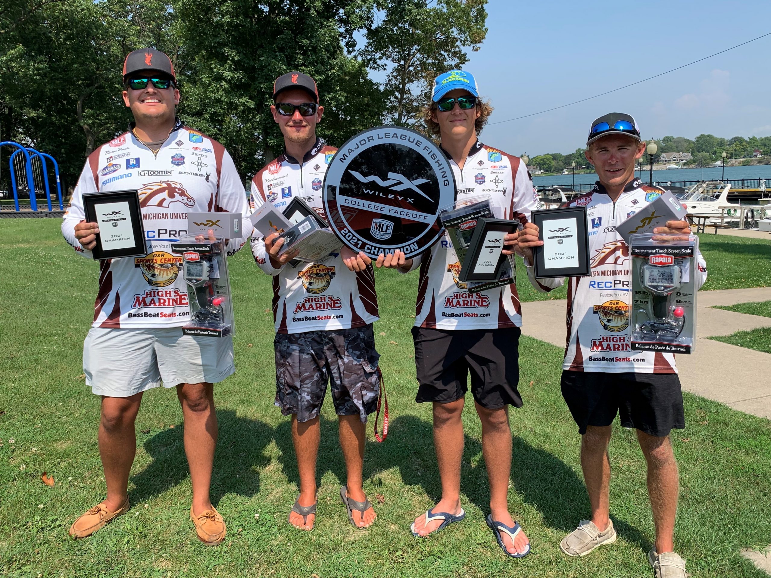 TRENTON, Mich. (Aug. 26, 2021) – The Western Michigan University team of Mason Vernia, Kurt Antonowitsch, Jack Simpson and Drake Van Dike, won the Major League Fishing (MLF) Wiley X College Faceoff at the Detroit River in Trenton, Michigan, Saturday. The Broncos bass club boated 44 bass weighing 109 pounds, 8 ounces to win the fourth and final Wiley X College Faceoff Events of the 2021 season and earn the win by a 14-pound, 11-ounce margin over Adrian College.