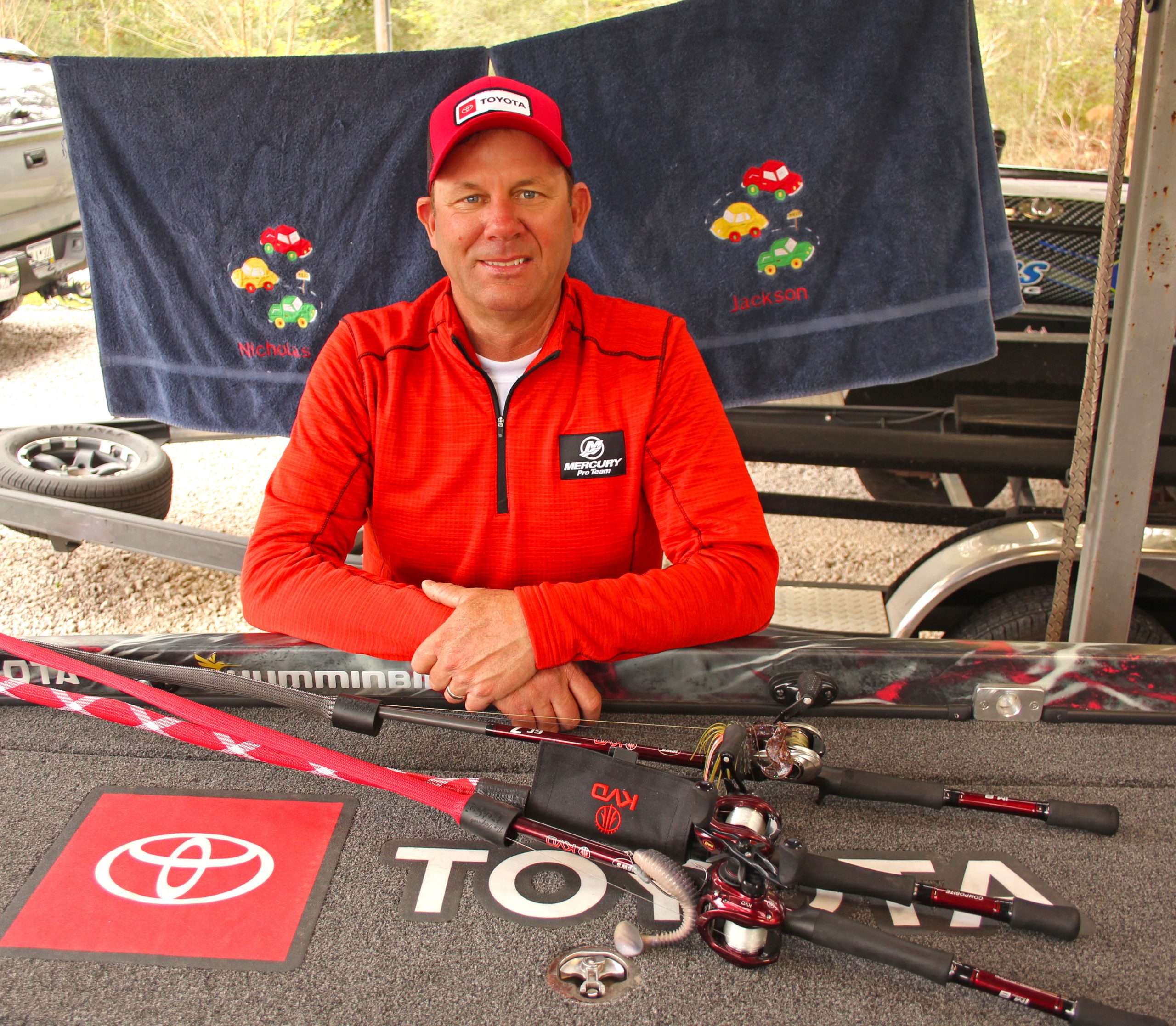 At first glance it might seem odd that pro bass fishing’s most accomplished and sometimes intimidating angler carries bath towels decorated with toy trucks. But take a closer look and you see the names of his now 24-year-old twin sons Jackson and Nicholas embroidered on them.