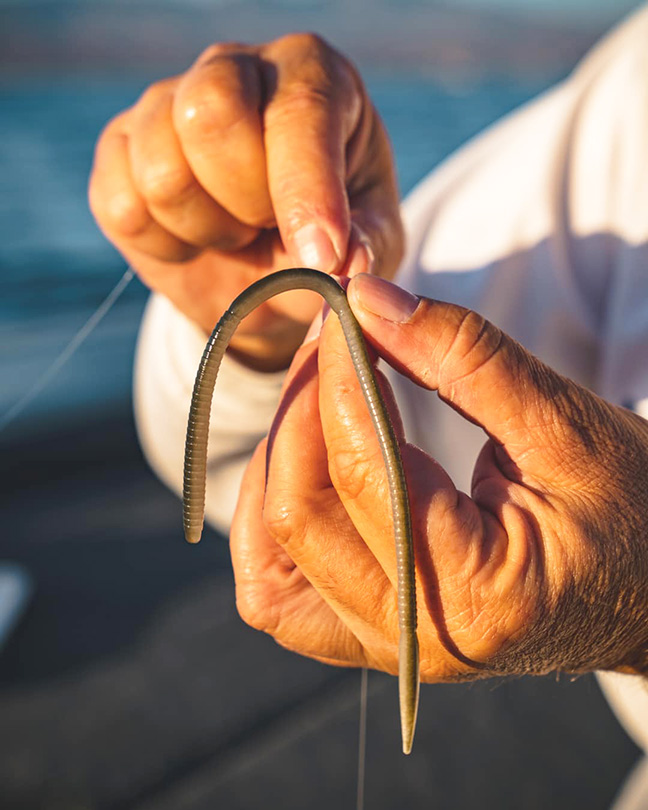 “All I can say is it’s money. You can catch everything from average-size fish to Southern California 10- to 12-pounders. When a bass eats it, the worm rolls up in its mouth just like a real worm. They’re awesome—and nobody’s making these. I’m super pumped.”