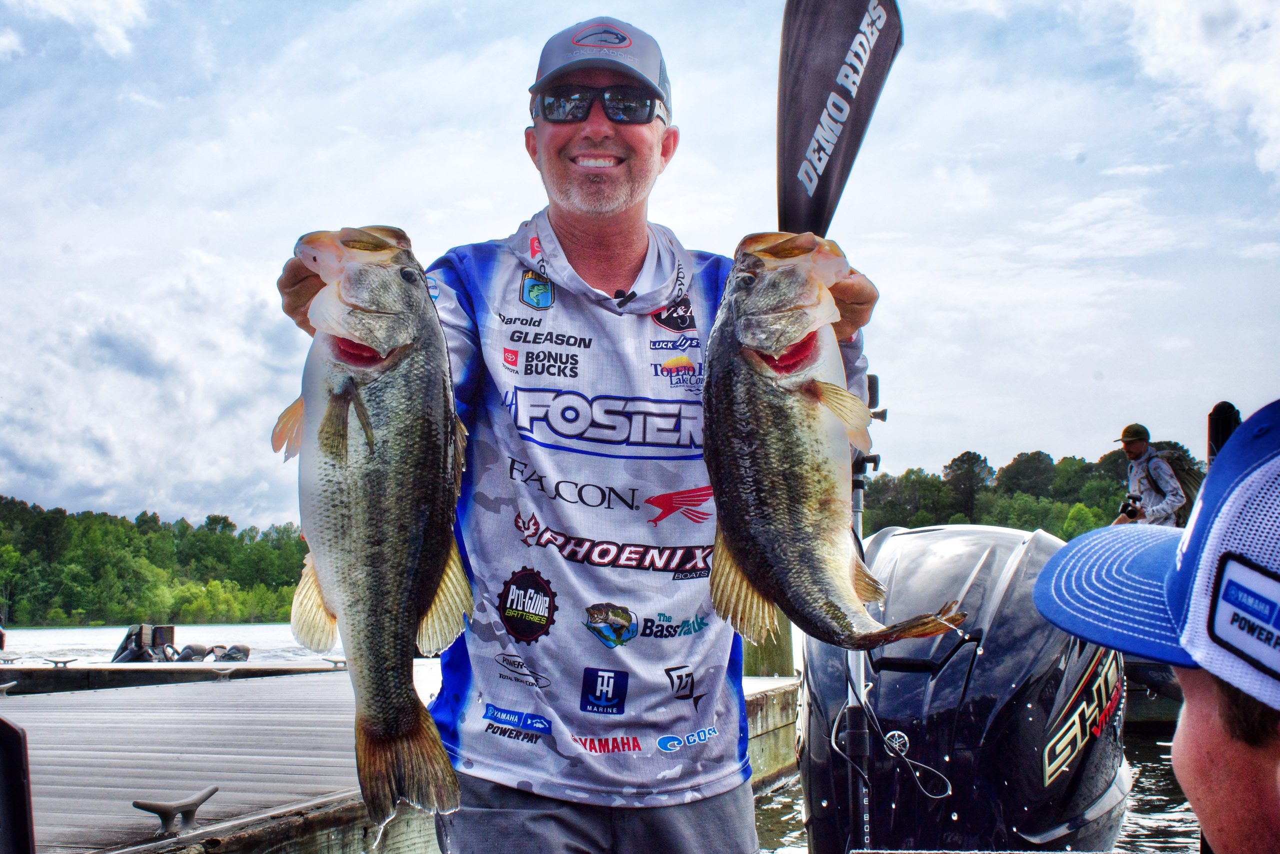 Darold Gleason had a great day one here in Clarendon County, South Carolina for the AFTCO Bassmaster Elite at Santee Cooper Lakes, weighing in 21-pounds 8-ounces of bass and finishing the opening round firmly in the top ten. His bag of fish was bolstered with the two “ocean ponies” you see him holding in the picture above.