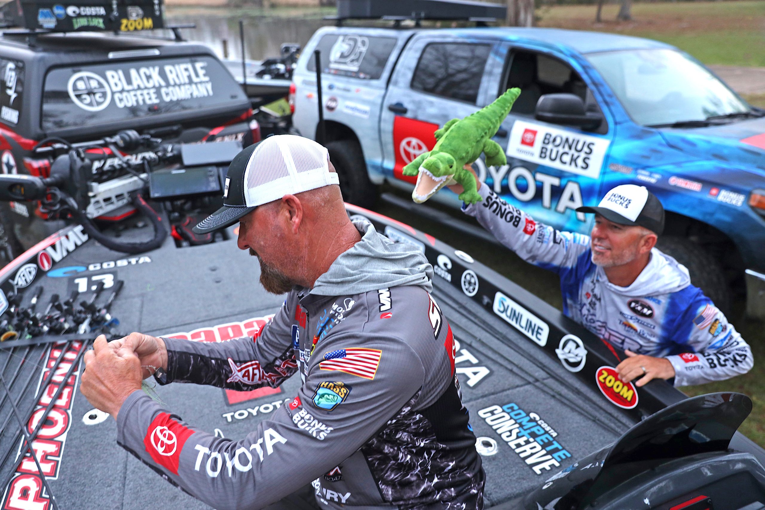 Q: If hypothetically, B.A.S.S. changed the rules, and the AOY points title was based on teams comprised of three anglers, what two other anglers would you choose to pair up with for the rest of this new season?